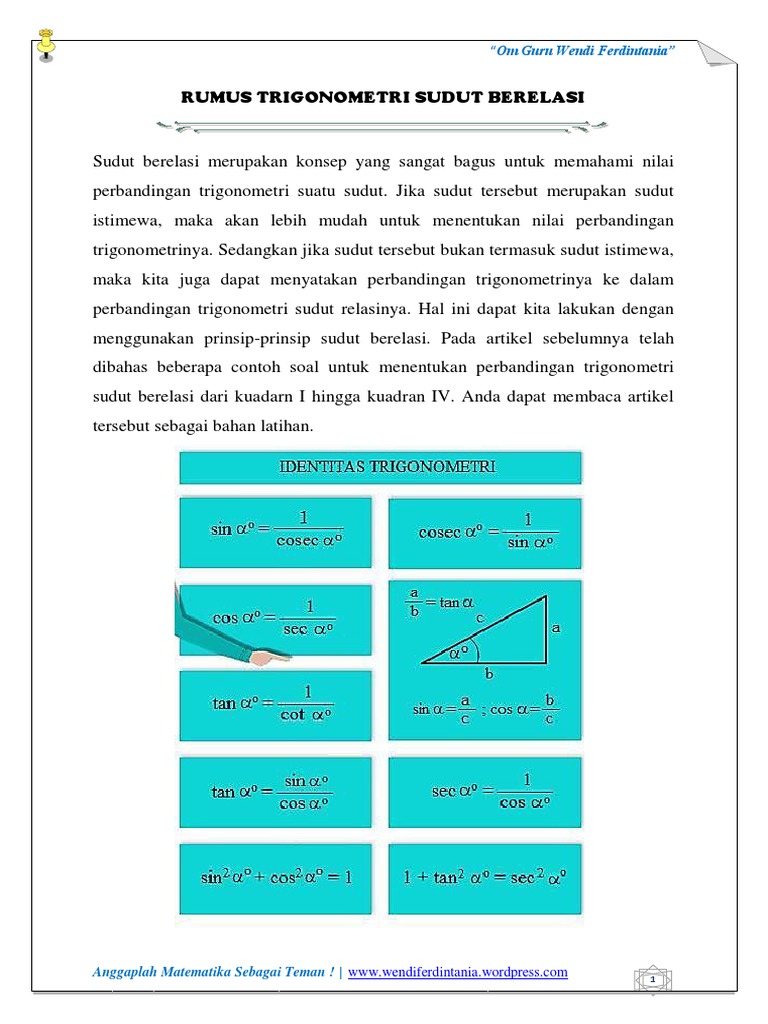 Identitas Trigonometri - Setelah sebelumnya ContohSoal.co.id telah membahas materi tentang Contoh Soal Aljabar dan Rumusnya. Hal ini karena arti dari kata trigonometri sendiri yang dalam bahasa Yunani yang berarti ukuran-ukuran dalam sudut tiga atau. Sudut-sudut berelasi adalah sudut-sudut yang memiliki hubungan satu sama lain seperti jumlah atau selisih.